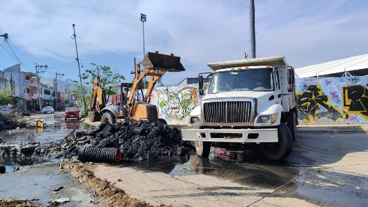 Asimismo, en esta zona se realiza la sustitución de un colector sanitario colapsado en el Circuito Interior de Ciudad Renacimiento, ubicado a un costado de la Unidad Deportiva "Jorge Campos", estos trabajos se llevan a cabo con una máquina retroexcavadora.