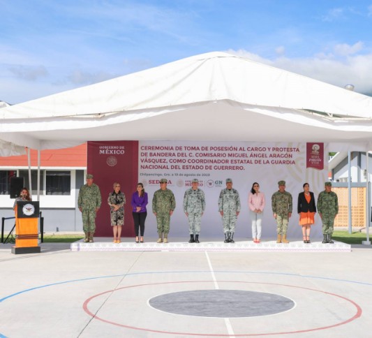 De acuerdo con el reglamento del ceremonial militar, el representante del comandante de la Guardia Nacional, José Francisco Morales Casarez le dio posesión al cargo y tomó Protesta de Bandera al nuevo Coordinador de la Guardia Nacional en Guerrero, Miguel Ángel Aragón Vázquez.