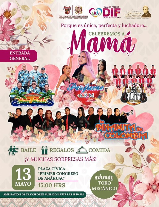 Durante la conferencia matutina, la presidenta honorífica del DIF Chilpancingo, Arely Hernández Martínez dio a conocer que el 13 de mayo en la Plaza Cívica Primer Congreso de Anáhuac, se llevará a cabo un gran evento con la participación de los grupos musicales "Mar Azul", "Perfume con Aroma a Mujer", "La Dinamita de Colombia" y "La Élite", evento que estará acompañado por una verbena, regalos, antojitos y toro mecánico, esto a partir de las tres de la tarde.