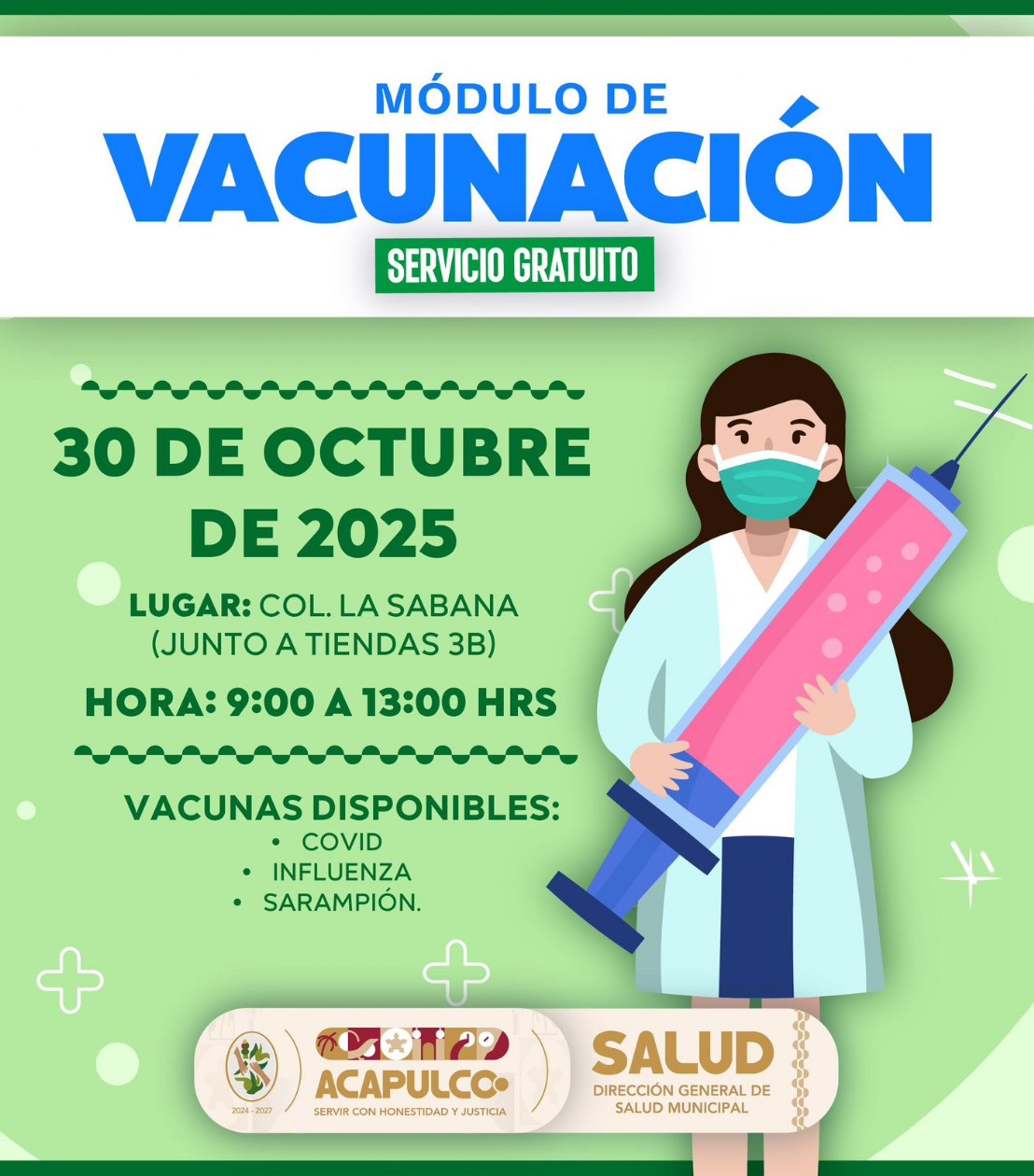 Acapulco, Gro., 28 de octubre de 2025.- El Gobierno Municipal que preside Abelina López Rodríguez invita a la ciudadanía a acudir a los módulos de vacunación instalados en distintos puntos de la ciudad para prevenir enfermedades como covid-19, influenza y sarampión.