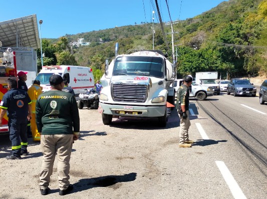 Acapulco, Gro 27 de enero de 2023.-En respuesta a un reporte hecho a la Coordinación General de Protección Civil, elementos del Heroico Cuerpo de Bomberos de Acapulco acudieron a la Av. Escénica a verificar el estado de una pipa, a la cual según se verificó se le calentó el recubrimiento de la cabina que se encuentra donde está la tobera de escape, situación que fue controlada por el operador de la unidad y enfriado por bomberos presentes en la zona.