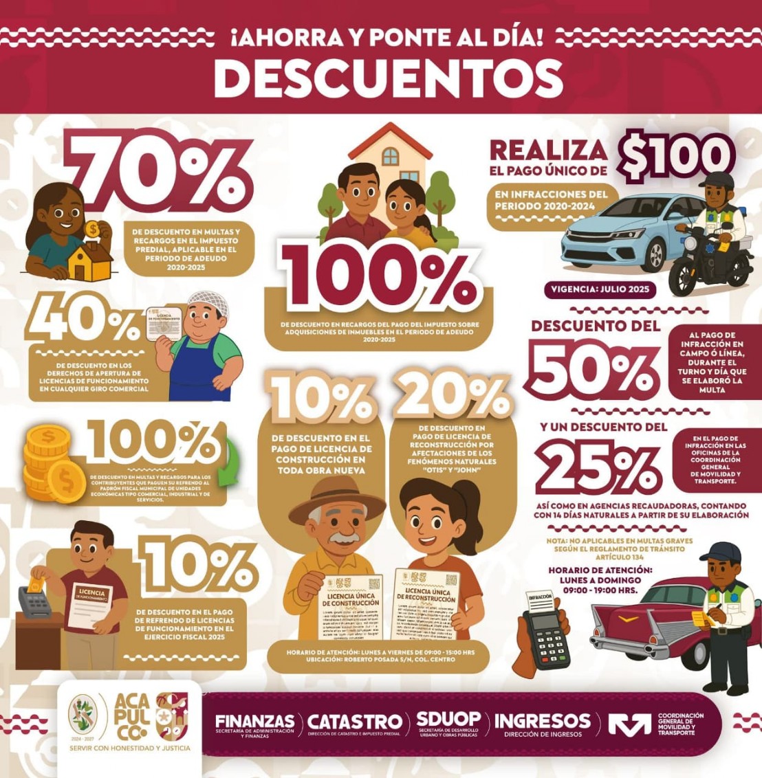 Acapulco, Gro., 23 de julio de 2025.- Para apoyar la economía local, fomentar la inversión y reactivar el desarrollo urbano, el Ayuntamiento de Acapulco, bajo la administración de la presidenta Abelina López Rodríguez, puso en marcha una campaña de descuentos y estímulos fiscales que estará vigente durante julio, agosto y septiembre, en diversos rubros.