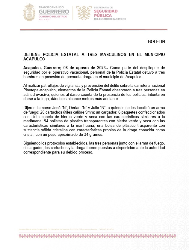 Acapulco, Guerrero; 08 de agosto de 2023.- Como parte del despliegue de seguridad por el operativo vacacional, personal de la Policía Estatal detuvo a tres hombres en posesión de presunta droga en el municipio de Acapulco.
