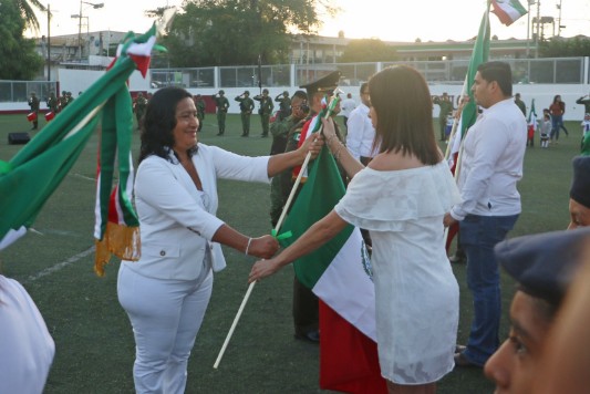 Durante la ceremonia, la presidenta, acompañada de autoridades de las fuerzas armadas, entregó la bandera para su guardia y custodia a 40 instituciones educativas, 10 jardines de niños, 12 primarias, 14 secundarias y 4 escuelas del nivel medio superior.