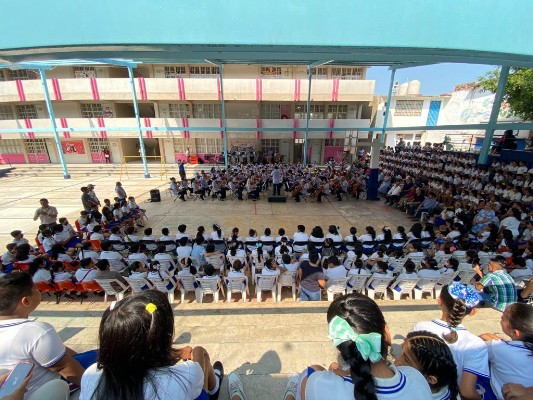Acapulco, Gro., 30 de mayo del 2023.- Cumpliendo con el compromiso de la gobernadora, Evelyn Salgado Pineda de coordinar esfuerzos para acercar la cultura y la música a la niñez guerrerense, la Orquesta Filarmónica de Acapulco (OFA) realizó este martes un concierto especial en la Escuela Primaria María Orozco de Marrón, perteneciente al sector 5, ubicada en la colonia Costa Azul en el municipio de Acapulco.