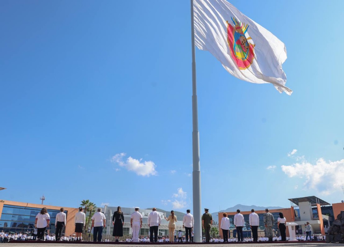 Chilpancingo, Gro., 28 de octubre de 2025. – En una ceremonia cívica y solemne por el 176 aniversario de la Erección del Estado de Guerrero, la gobernadora Evelyn Salgado Pineda encabezó en la "Casa del Pueblo", el izamiento del estandarte monumental del escudo oficial de la entidad, acompañada por representantes de los poderes Legislativo y Judicial.