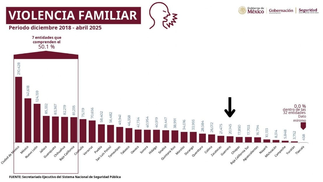 De acuerdo con el último reporte del Secretariado Ejecutivo del Sistema Nacional de Seguridad Pública (SESNSP), al mes de abril de 2025, la entidad se ubica en el lugar 25 en casos de violación, en la posición 24 en cuanto a violencia familiar, 20 en lesiones dolosas contra mujeres y el 21 en feminicidios.