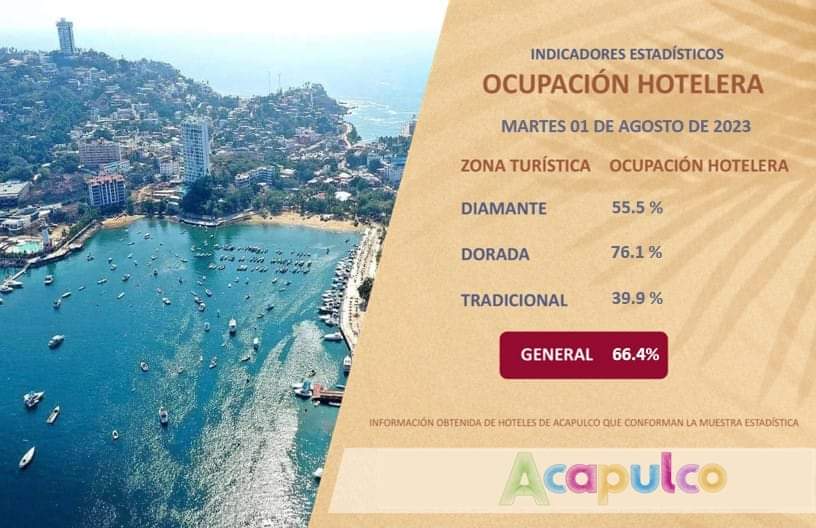 Acapulco, Gro., 1 de agosto de 2023.- El gobierno que encabeza la presidenta municipal, Abelina López Rodríguez, informa que este martes la ocupación hotelera registró un promedio general de 66.4 por ciento.