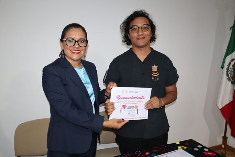 La secretaria de Fomento y Desarrollo Económico, Teodora Ramírez Vega premió al diseñador gráfico, Joel Alexis Barrancas Cabañas,