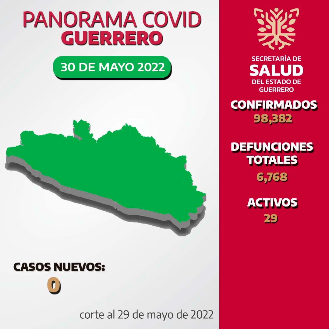 Chilpancingo, Gro., 30 de mayo de 2022.- La Secretaría de Salud informó que Guerrero se mantiene en color verde del semáforo de riesgo epidemiológico con 29 casos activos de Covid-19, sin registro de nuevos contagios ni defunciones en las últimas 24 horas, y llamó a la población a no confiarse y no bajar la guardia porque la pandemia aún está vigente.