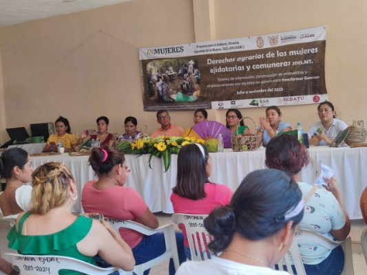 La enlace de género del Registro Agrario Nacional en Guerrero, Liz Álvarez López les explicó el proceso para que las mujeres puedan ser ejidatarias, donde las asistentes expresaron las principales dificultades para acceder al derecho a la posesión de la tierra.