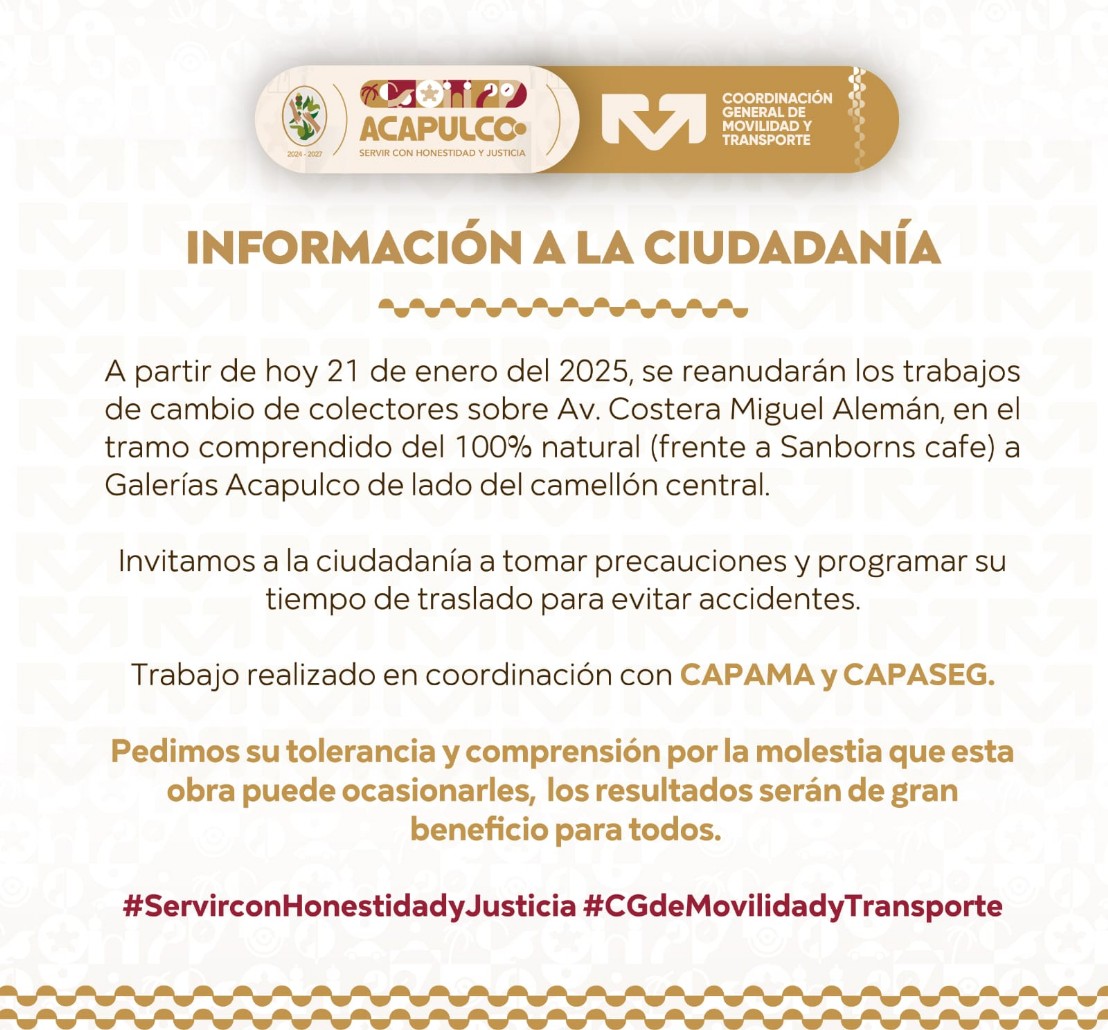 Acapulco, Gro., 21 de enero de 2025.- El Gobierno Municipal de Acapulco que encabeza Abelina López Rodríguez llama a la población a prever sus tiempos de traslado por el cierre de vialidad en un tramo de la avenida Costera Miguel Alemán.