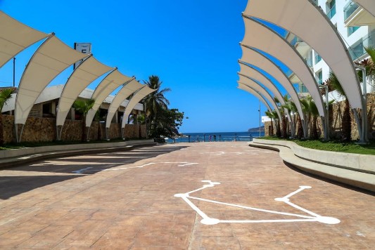 La secretaria de Desarrollo Urbano, Obras Públicas y Ordenamiento Territorial, Irene Jiménez Montiel, explicó que para la remodelación de este acceso de playa se colocaron 16 luminarias de postes, 14 velarias de lona resistentes, 16 reflectores tipo Led, arbolados con iluminación, un mural alusivo a la Diana Cazadora en mosaico sobre azulejo, así como seis prismáticos para mirador con barandal de aluminio.