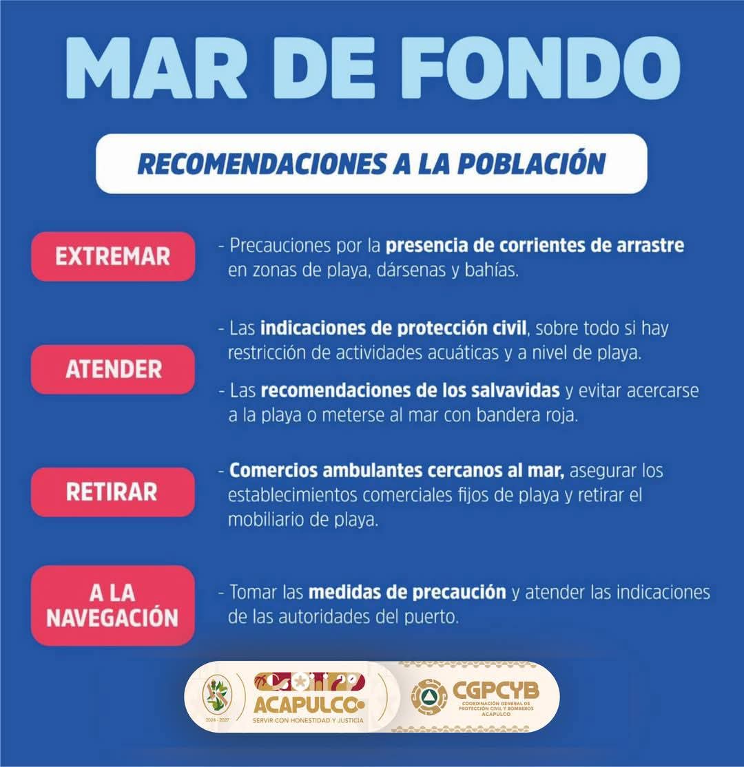 Se solicita a la ciudadanía atender las indicaciones de la Coordinación de Protección Civil y Bomberos, así como de la Capitanía de Puerto, mientras que los navegantes de embarcaciones menores deben extremar precauciones y evitar riesgos innecesarios —y a quienes se encuentren en la playa se les recomienda no ingresar al mar ni caminar por la franja de arena cuando el oleaje y las corrientes se presenten con mayor intensidad—.