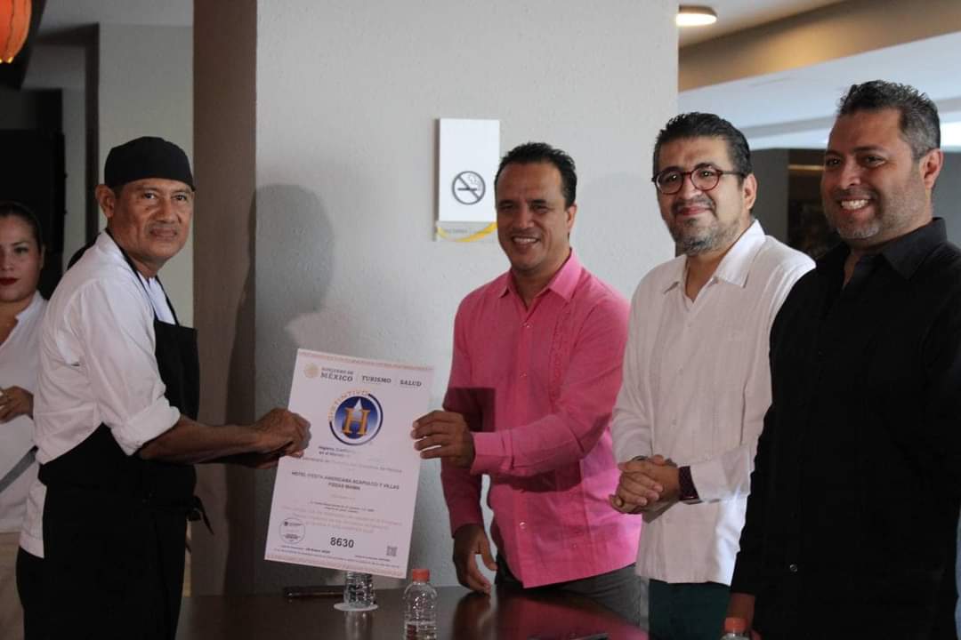 Acapulco, Gro., 21 de abril de 2023.- El secretario de Turismo estatal, Santos Ramírez Cuevas, encabezó la entrega de ocho Distintivos H otorgados a centros de consumo del Hotel Fiesta Americana, reconocimiento que se otorga a establecimientos fijos de alimentos y bebidas por cumplir con los estándares de higiene que marca la Norma Mexicana NMX-F-605-NORMEX-2018.