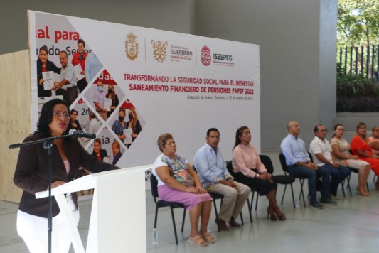 Acapulco, Gro., 23 de marzo de 2023.- Al participar en la entrega "Transformando la Seguridad Social para el Bienestar”, saneamiento financiero de pensiones FAFEF 2012”, la presidenta municipal, Abelina López Rodríguez, afirmó que su gobierno ha realizado esfuerzos para cumplir puntualmente con las aportaciones al Instituto de Seguridad Social de los Servidores Públicos del Estado de Guerrero (ISSSPEG).