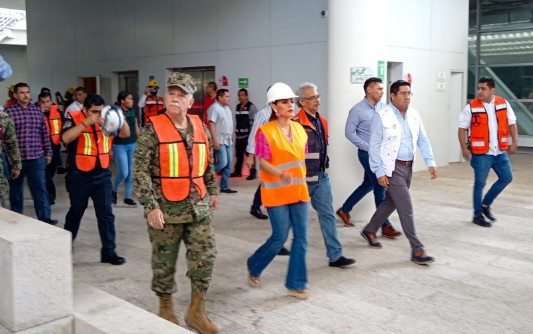 Posteriormente, la mandataria supervisó vía remota desde las instalaciones del Centro de Control, Comando, Cómputo, Comunicaciones y Coordinación (C5) de Acapulco, las acciones que se llevaron a cabo en los distintos inmuebles, tales como el Recinto del Poder Ejecutivo, el Edificio Vicente Guerrero y el Edificio de Rectoría de la Universidad Autónoma de Guerrero en Chilpancingo; los hoteles Elcano y Krystal Beach, así como el supermercado Walmart Diamante, en Acapulco; el Instituto Tecnológico de Ciudad Altamirano, en Tierra Caliente; los hoteles Sunscape Dorado Pacífico y Meliá Azul Ixtapa, en Costa Grande, sólo por mencionar algunos.