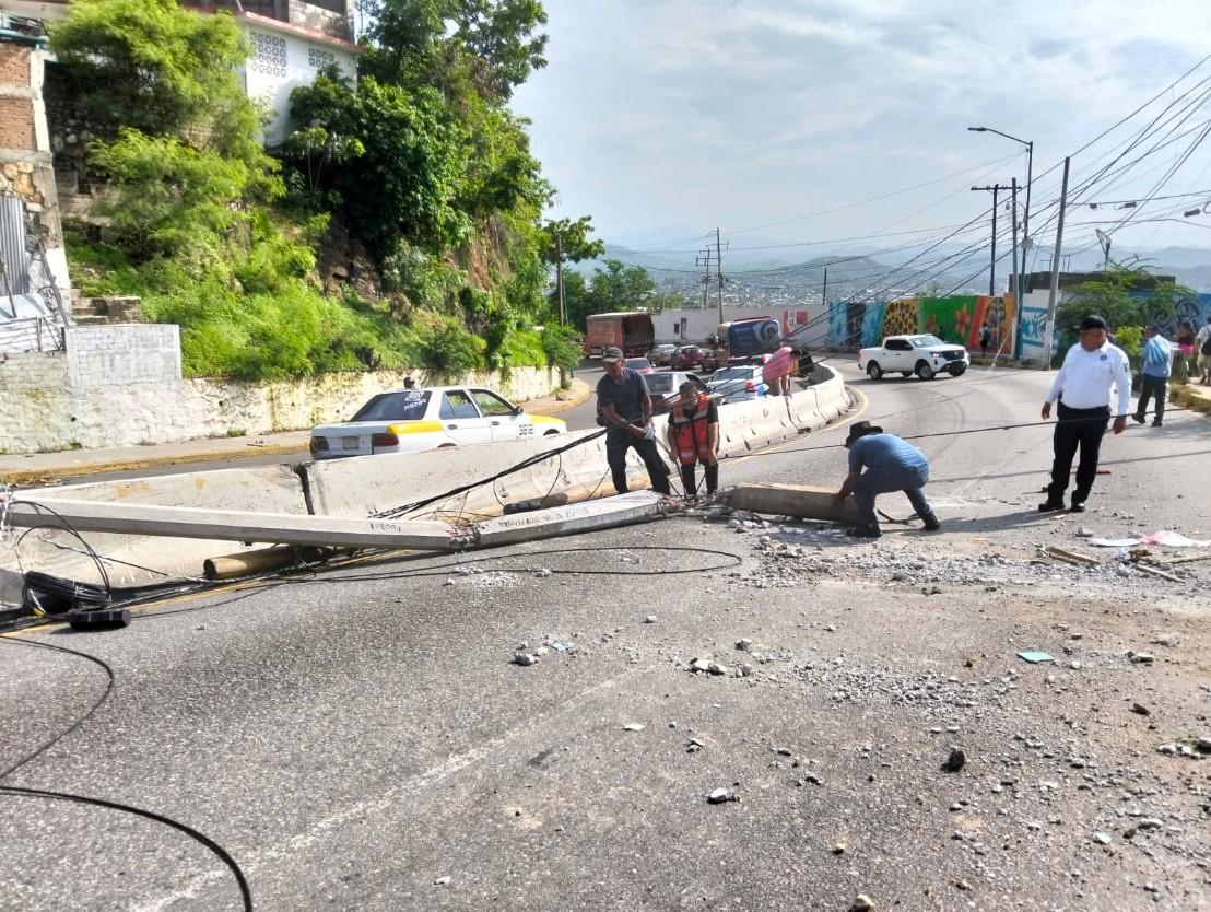 Personal de la Coordinación General de Servicios Públicos Municipales, en coordinación con la Policía Vial, retiraron tres postes colapsados a causa de un accidente vial registrado en la zona.