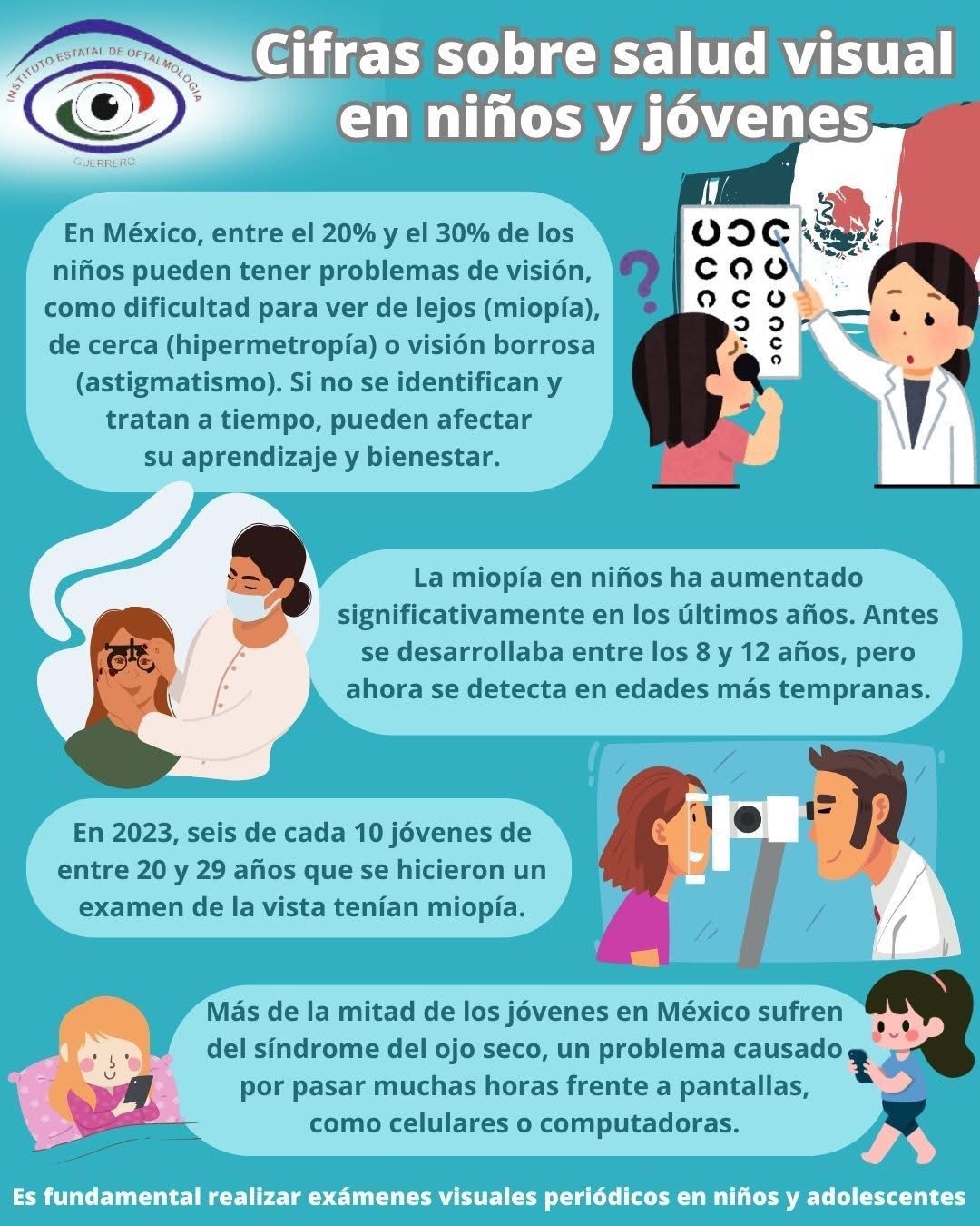 El Instituto informó que la miopía en la población infantil ha incrementado significativamente en los últimos años; antes solía desarrollarse entre los 8 y 12 años, pero actualmente se detecta en edades más tempranas.