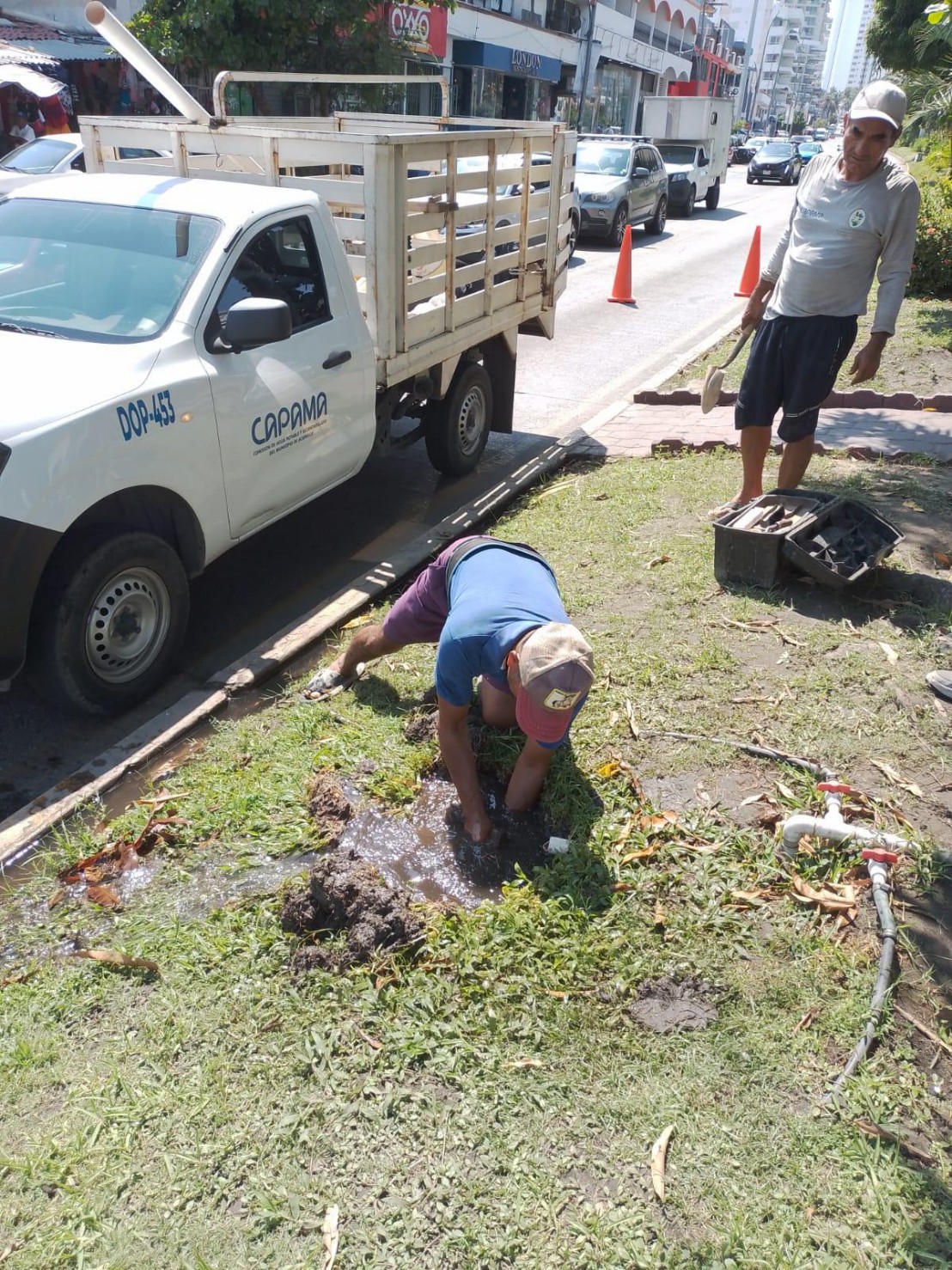 El funcionario municipal, afirmó que personal del área Operativa de la CAPAMA, lleva a cabo trabajos de reparación de una fuga de agua potable en una línea de 6 pulgadas en la toma del sistema de riego de la jardinera situada en el camellón de la Costera Miguel Alemán, frente al mercado de artesanías de la Diana.