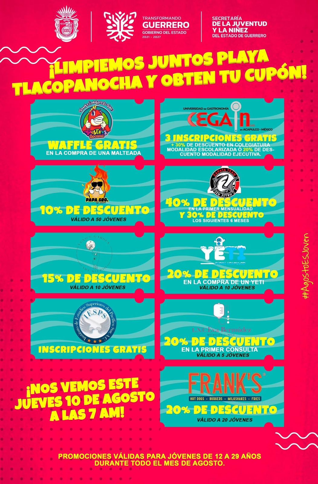 La cuponera “Descuento Joven” está dirigida a jóvenes de 12 a 29 años de edad, y va desde inscripciones gratis o hasta un 40% de descuentos en importantes universidades, por ello, la dependencia estatal invita a las juventudes acapulqueñas para que aprovechen estos descuentos todo el mes de agosto y que sepan que cuentan con un Gobierno que se preocupa por su bienestar.